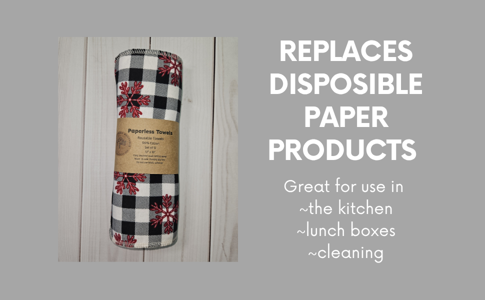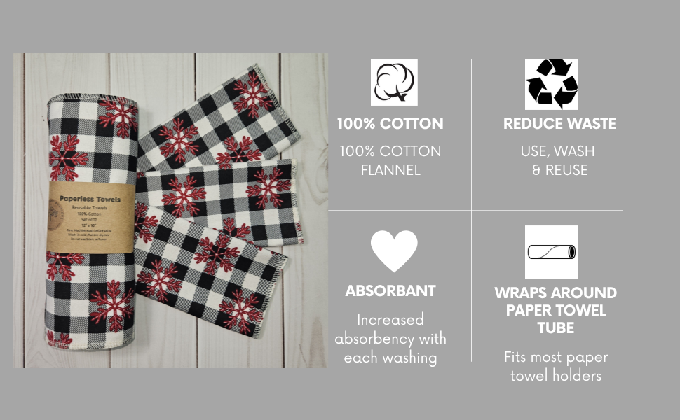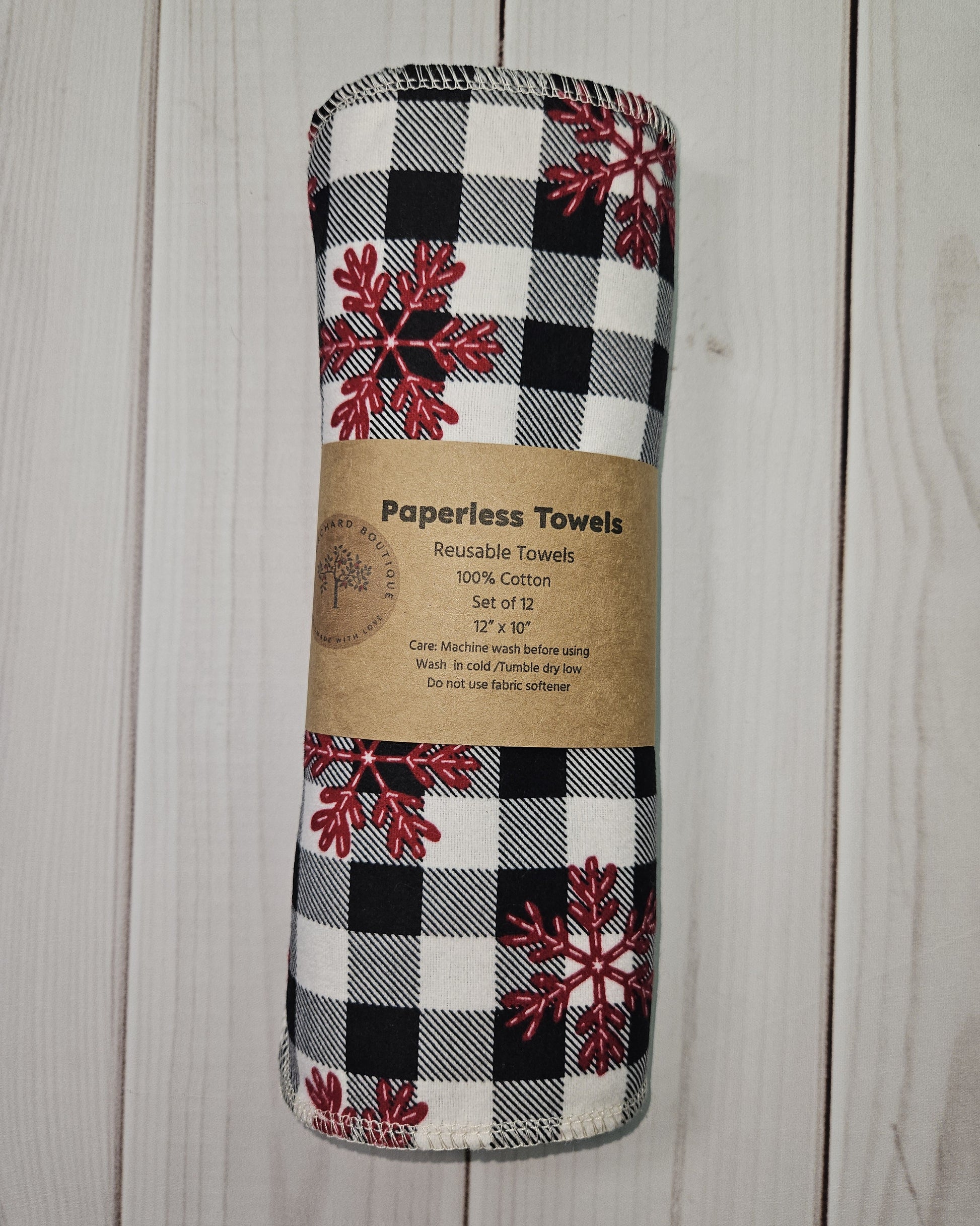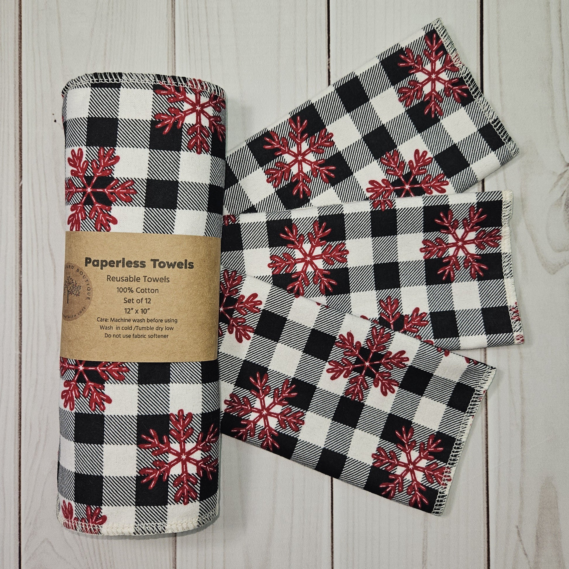 Buffalo Check with Red Snowflakes Paperless Towels. These paperless towels are a great alternative to traditional paper towels. Save money and reduce waste. Great way to replace your paper towels.