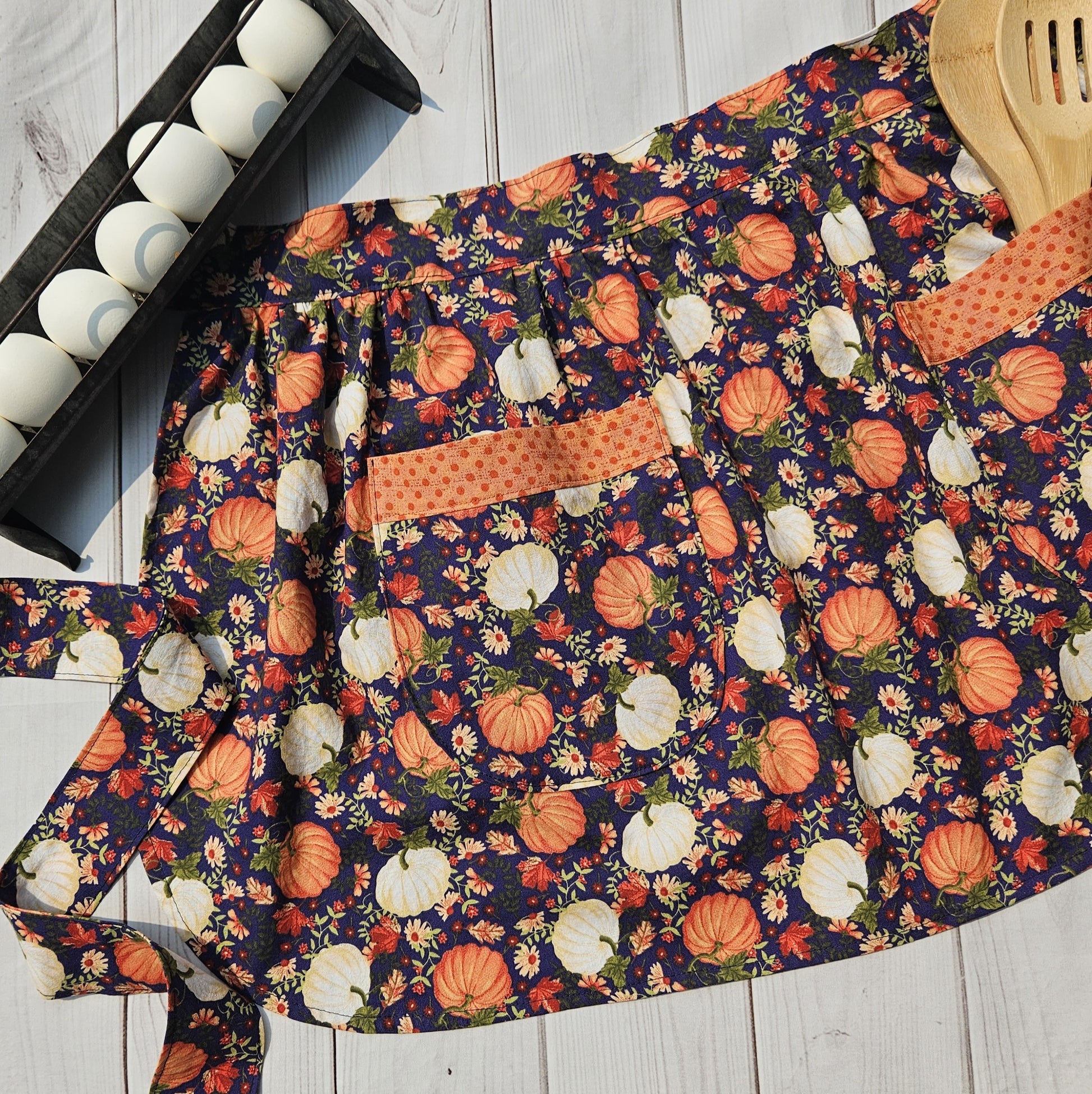 Pumpkins on Navy Retro Half Apron with Orange Trimmed Pockets