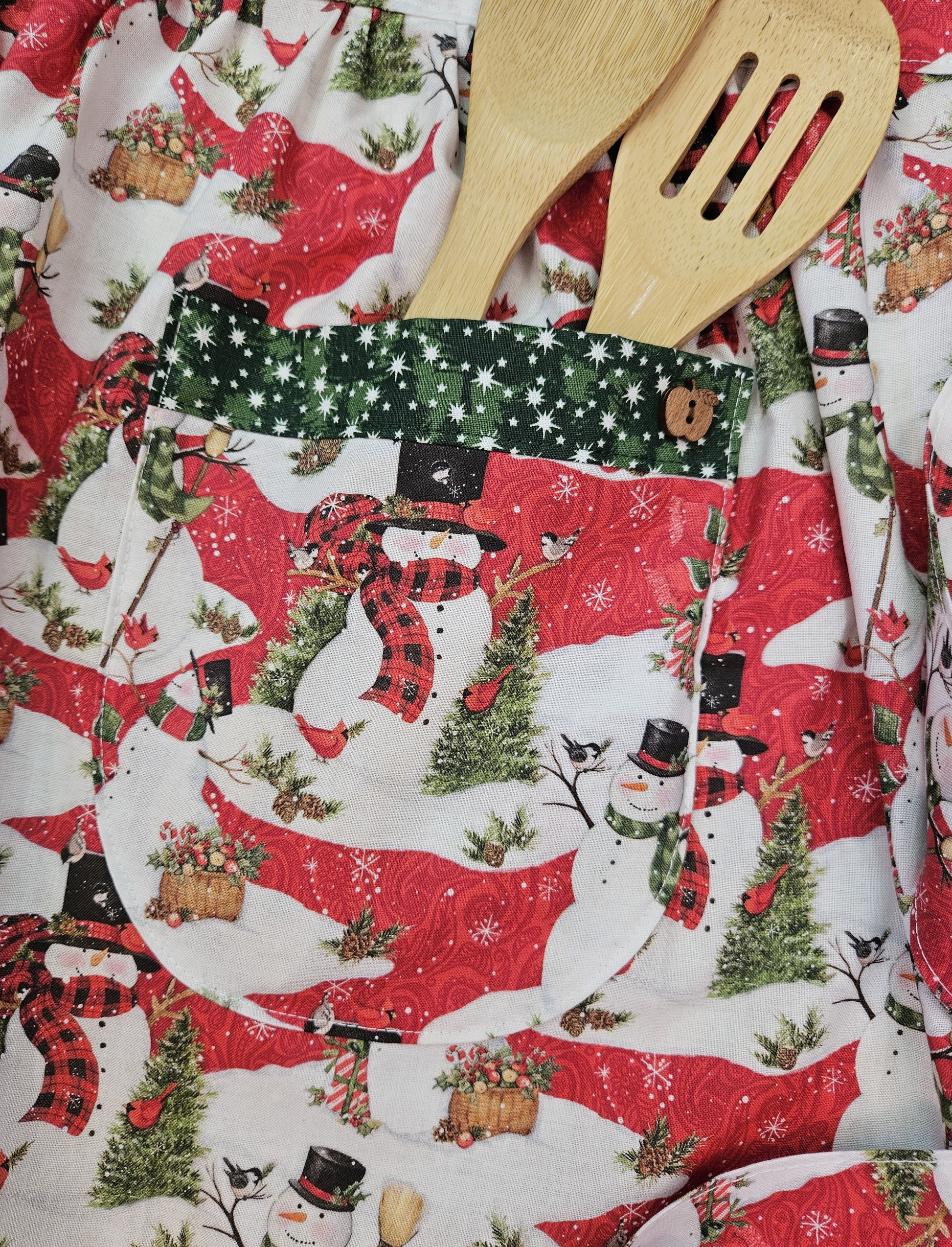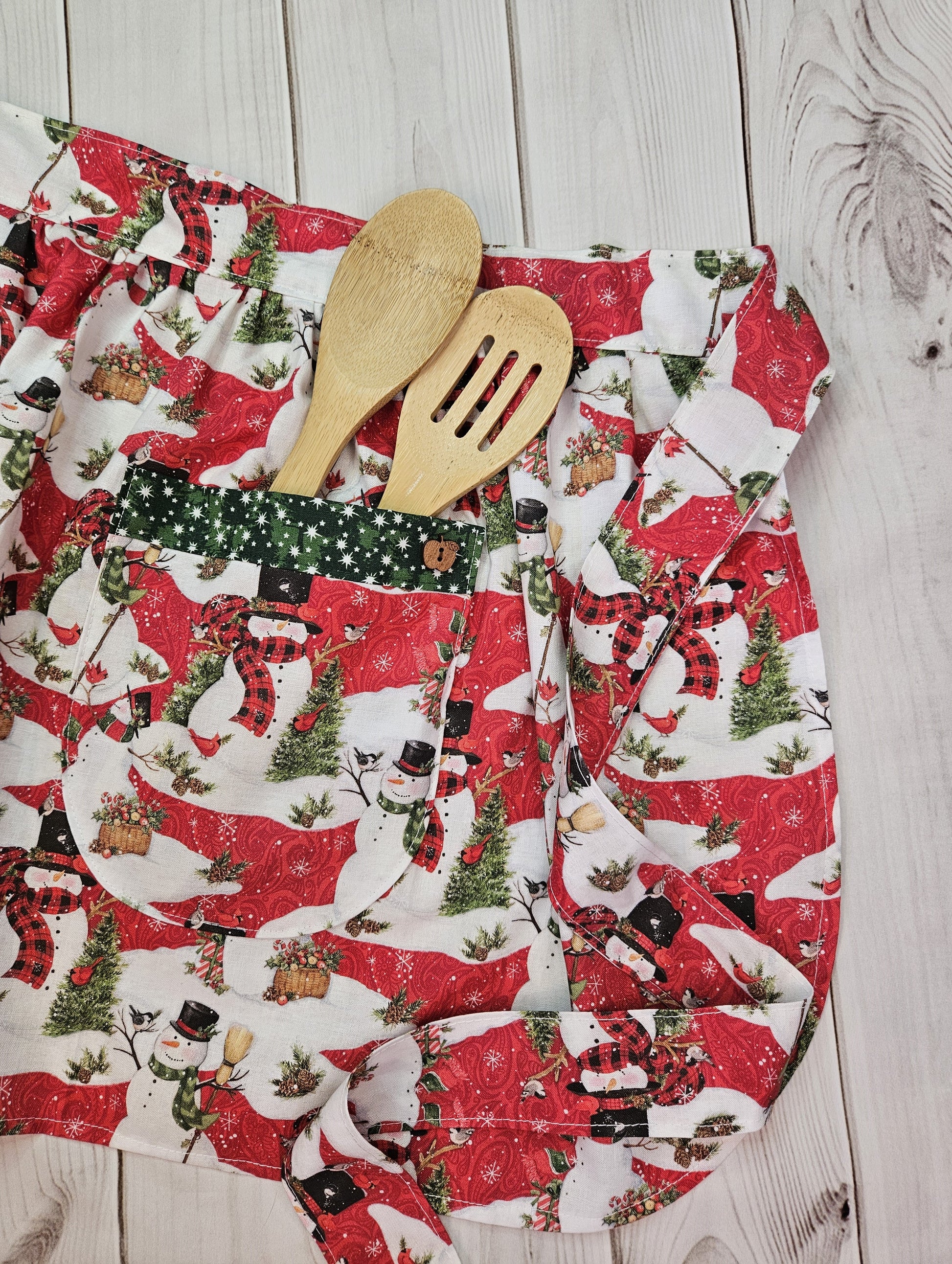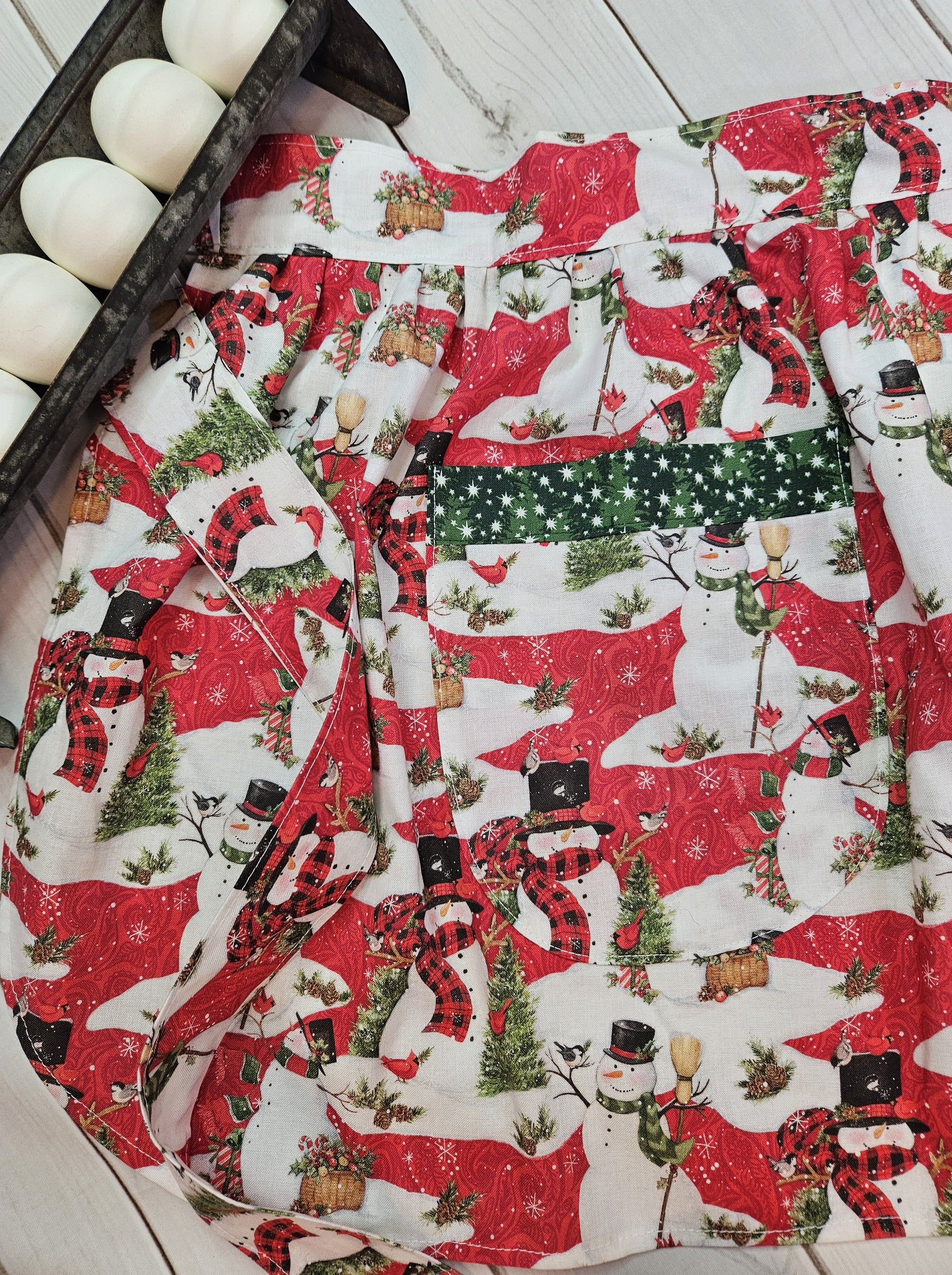 This CHRISTMAS SNOWMAN print half apron ties comfortably at the waist with coordinating pockets. Each apron has two tulip-style pockets trimmed with coordinating green fabric. This is the perfect apron for all of your cooking needs. Of course this apron has the signature apple button that is added with love to all of LuLu Orchard aprons!