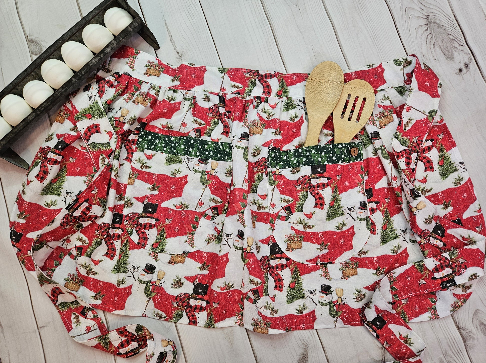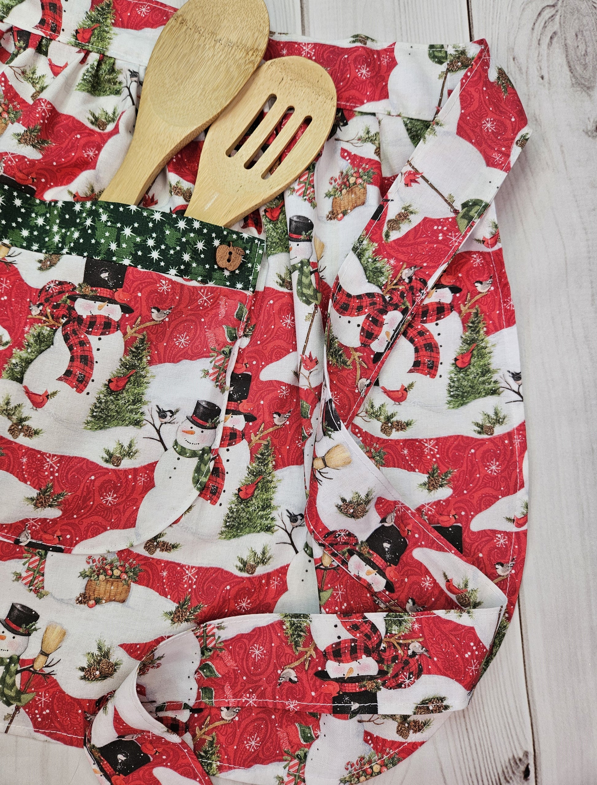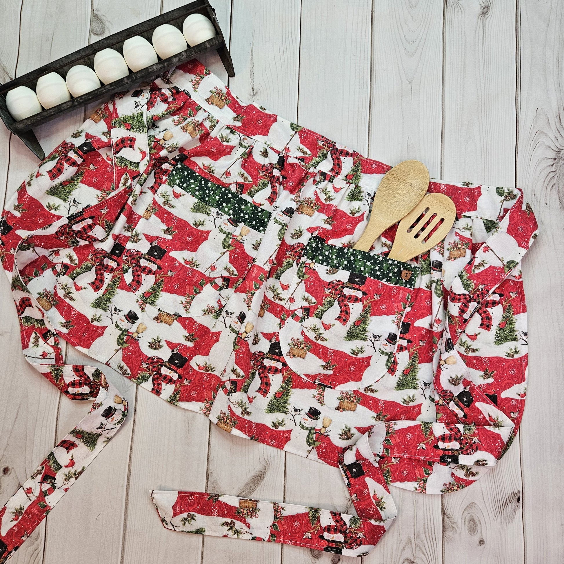 This CHRISTMAS SNOWMAN print half apron ties comfortably at the waist with coordinating pockets. Each apron has two tulip-style pockets trimmed with coordinating green fabric. This is the perfect apron for all of your cooking needs. Of course this apron has the signature apple button that is added with love to all of LuLu Orchard aprons!